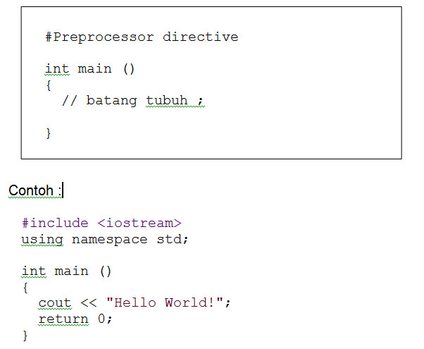 bahasa C++ memiliki sebuah main. main diikuti oleh sebuah tanda kurung ()